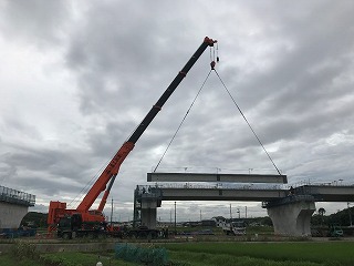 東播磨道北工区(加古川市~小野市)の建設工事が最盛期。毎日風景が変わっています。加古川市八幡町内では橋梁工事。日本最大級の550t吊りクレーン車による長さ約24mの橋桁架設は見応えがありました。