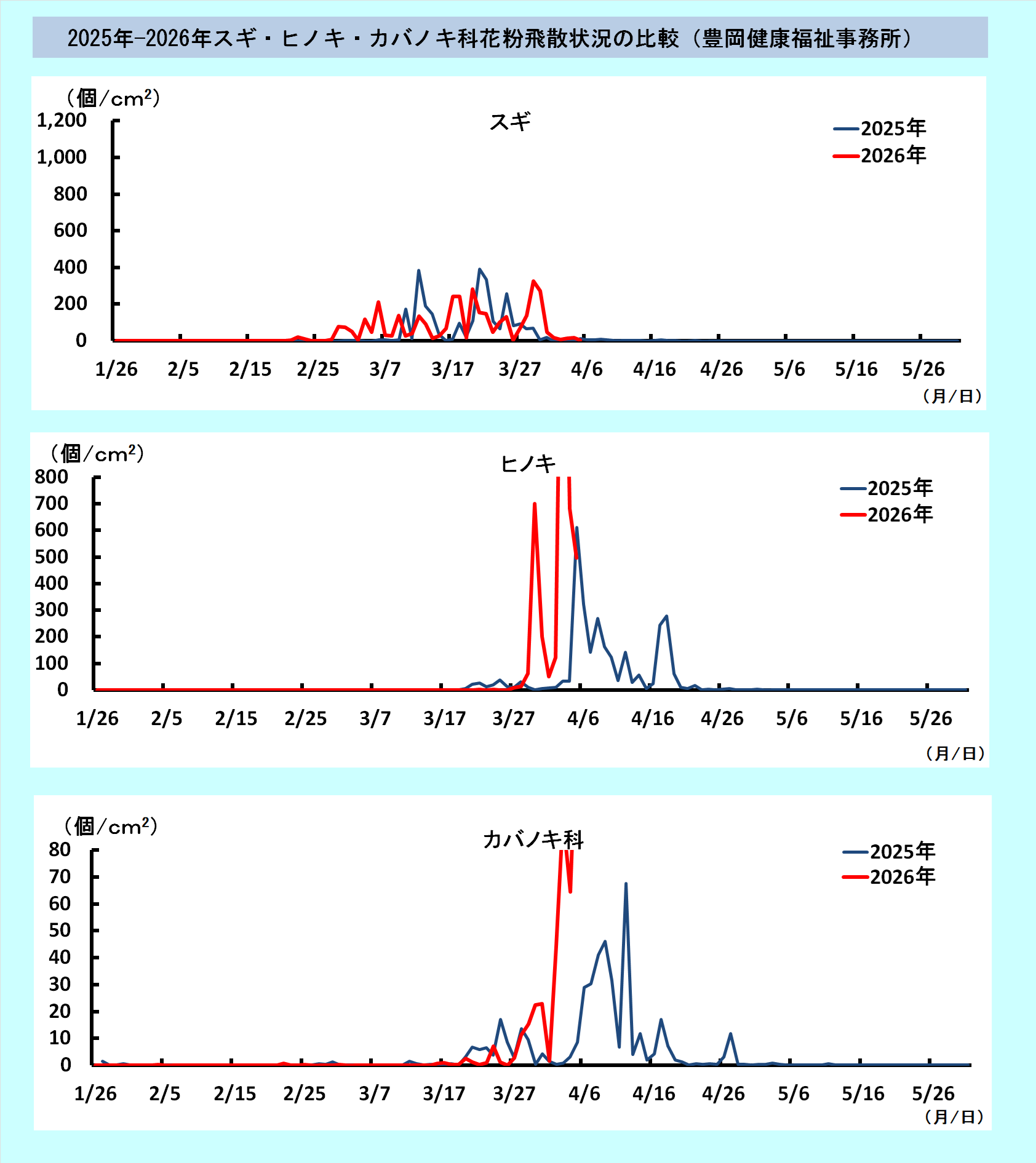 シーズン(2025年)と今シーズン(2026年)のスギ・ヒノキ・カバノキ科花粉飛散状況の比較