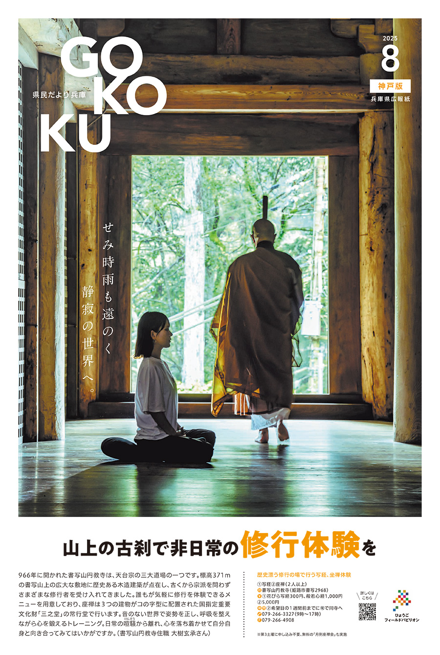 966年に開かれた書写山円教寺は、天台宗の三大道場の一つです。標高371mの書写山上の広大な敷地に歴史ある木造建築が点在し、古くから宗派を問わずさまざまな修行者を受け入れてきました。誰もが気軽に修行を体験できるメニューを用意しており、座禅は3つの建物がコの字型に配置された国指定重要文化財「三之堂」の常行堂で行います。音のない世界で姿勢を正し、呼吸を整えながら心を鍛えるトレーニング。日常の喧騒(けんそう)から離れ、心を落ち着かせて自分自身と向き合ってみてはいかがですか。(書写山円教寺住職 大樹玄承さん)