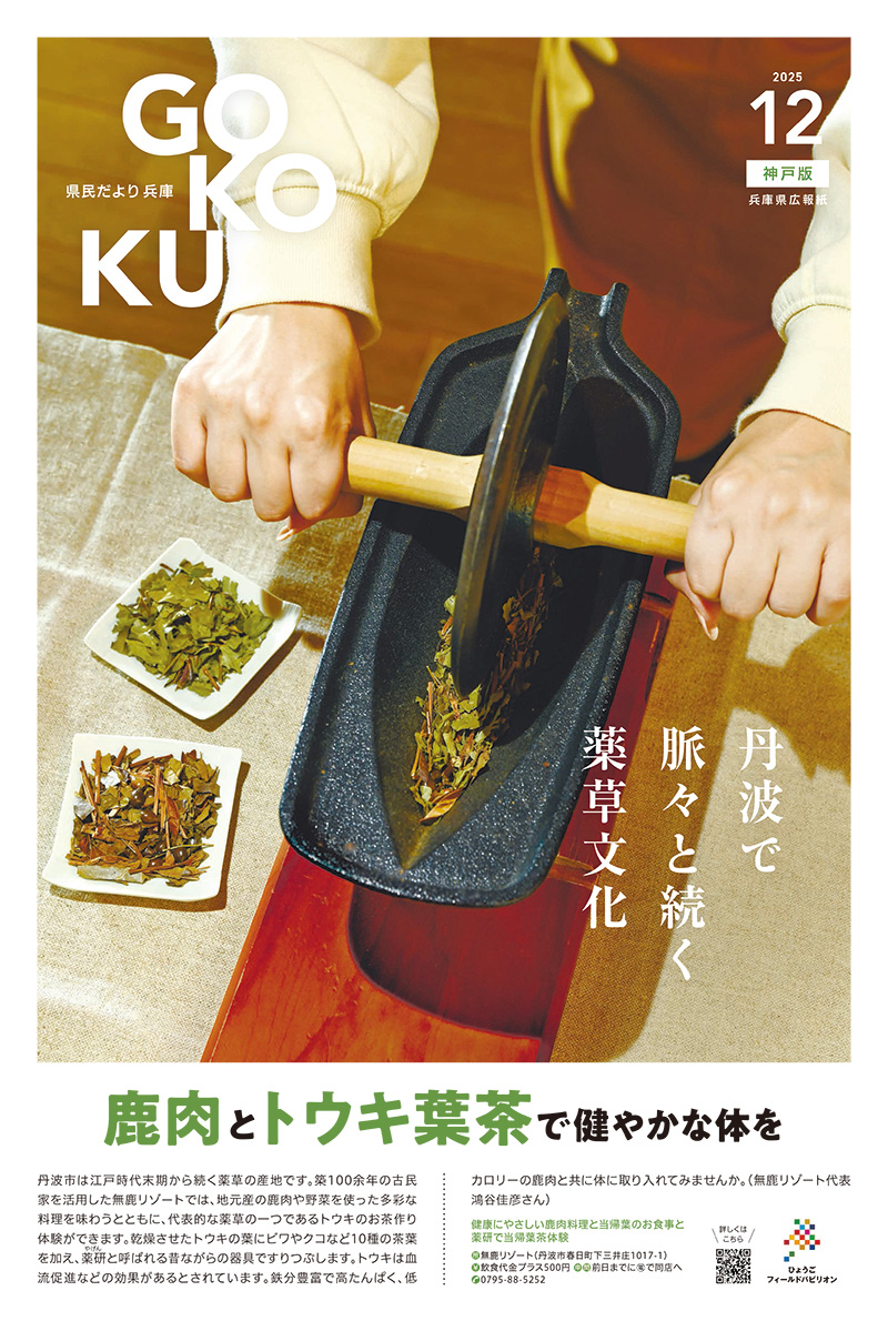 丹波市は江戸時代末期から続く薬草の産地です。築100余年の古民家を活用した無鹿リゾートでは、地元産の鹿肉や野菜を使った多彩な料理を味わうとともに、代表的な薬草の一つであるトウキのお茶作り体験ができます。乾燥させたトウキの葉にビワやクコなど10種の茶葉を加え、薬研(やげん)と呼ばれる昔ながらの器具ですりつぶします。トウキは血流促進などの効果があるとされています。鉄分豊富で高たんぱく、低カロリーの鹿肉と共に体に取り入れてみませんか。(無鹿リゾート代表 鴻谷佳彦さん)