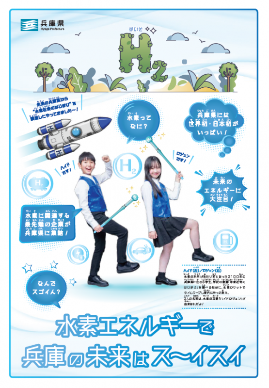 兵庫県では、2050年頃に私たちの日常生活等において水素が利活用される「水素社会」の実現を目指しており、その一環として、将来の担い手となる小学4~6年生向けの教材(動画・デジタルリーフレット)を制作しました。