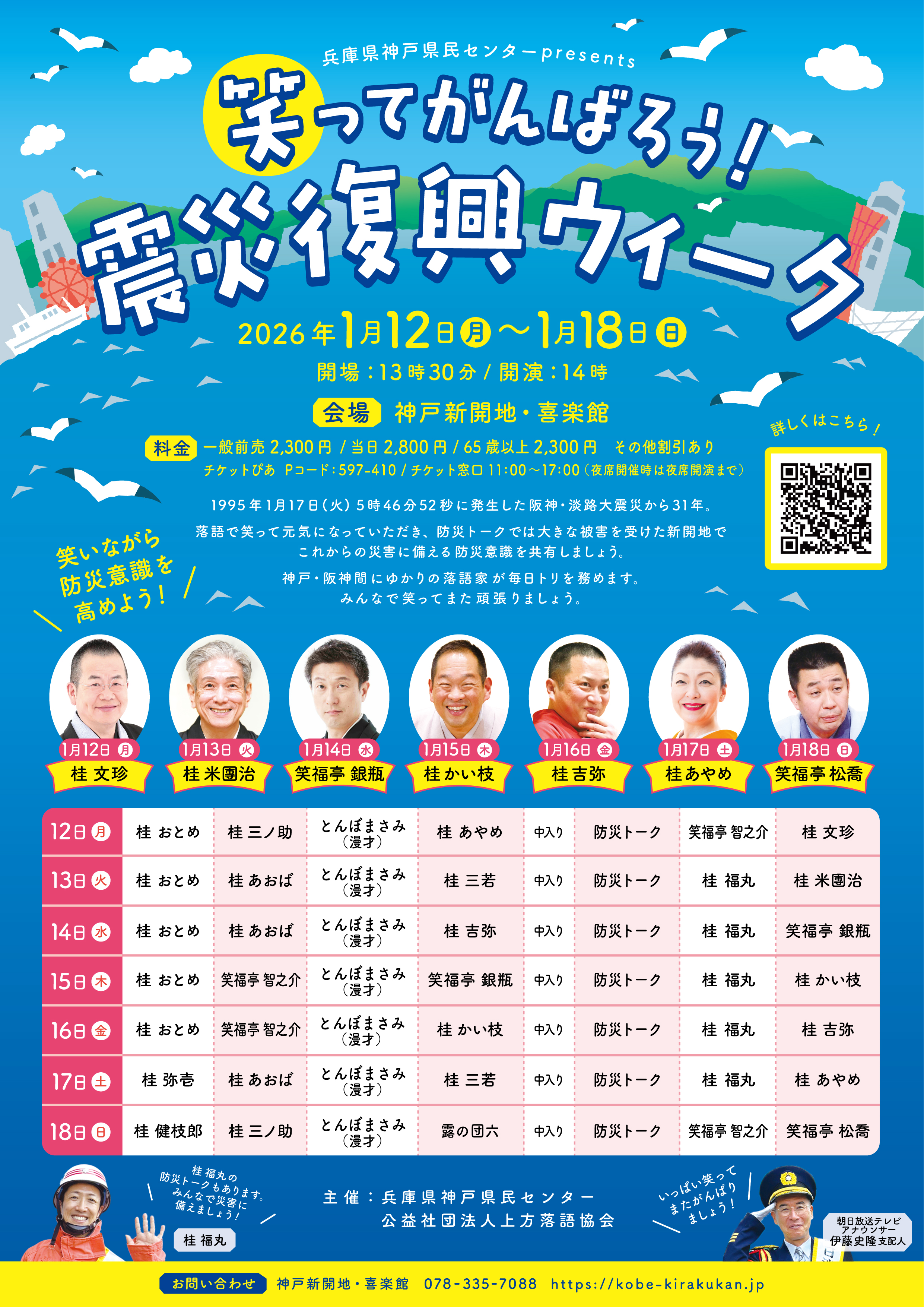 神戸新開地・喜楽館では、2026年1月12日(月曜日・祝)~18日(日曜日)に兵庫県神戸県民センターpresents「笑ってがんばろう!震災復興ウィーク」と銘打って、特別企画を開催します。
