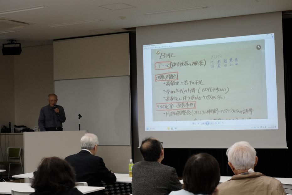 分科会で出されたアイデアを他班と共有するため発表しました。発表内容は服部名誉教授に講評いただきました。