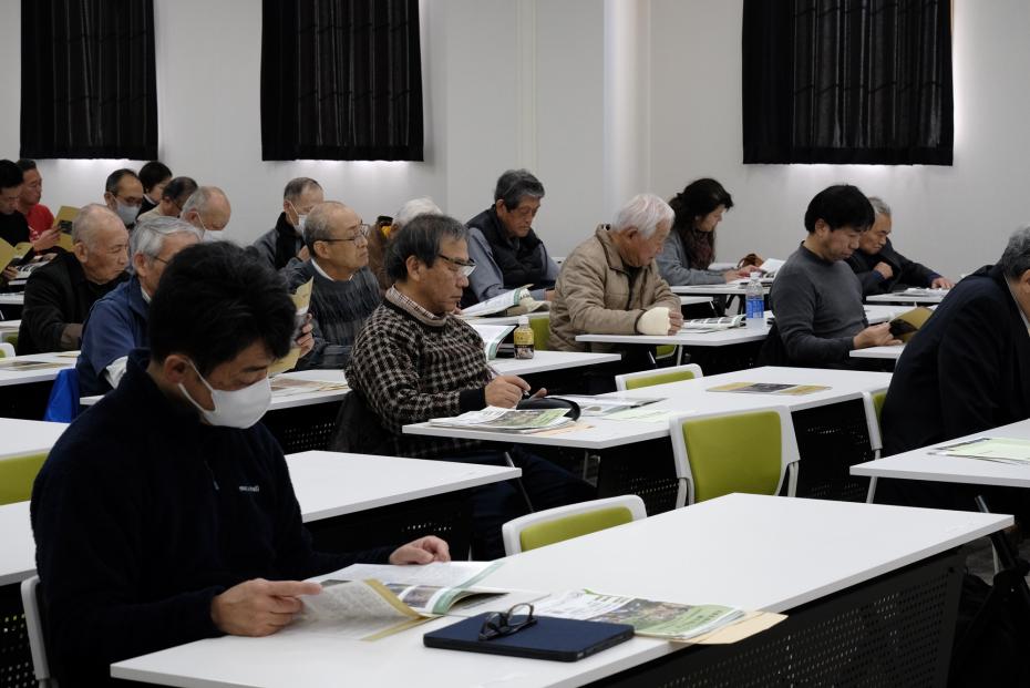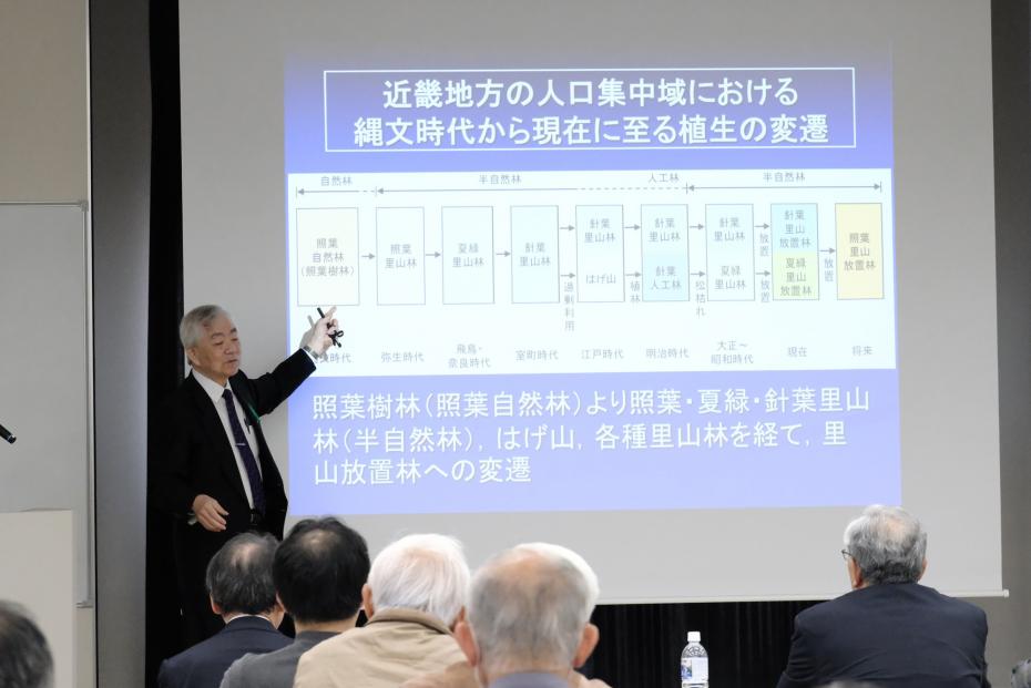 兵庫県立大学服部保名誉教授から「市民参加によるこれからの里山林整備」と題して基調講演いただきました。講演において、里山の現状について示されたのち、それぞれの里山の状況に応じた管理方針が提案され、参加者は熱心に聞き入っていました。