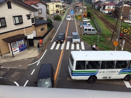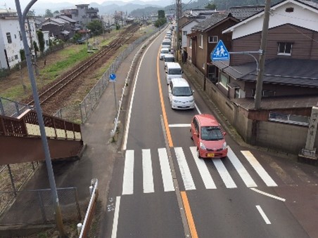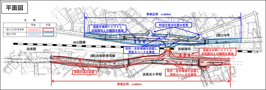 本路線は、京都府舞鶴市を起点に兵庫県の豊岡市街地、山陰近畿自動車道を経由し鳥取県岩美町を結ぶ主要幹線道路です。新温泉町内ではJR山陰本線と浜坂駅南側で並走し、浜坂踏切を含む距離の短い町道で都市計画道路の浜坂駅港湾線と接続している交通の要衝となっています。そのため、本事業では付加車線の設置と踏切内を含む歩道の設置を行うことで交通の錯綜を緩和し、付近にある小中学校の生徒、児童の安全を向上するとともに朝夕の慢性的な渋滞の解消を図ります。