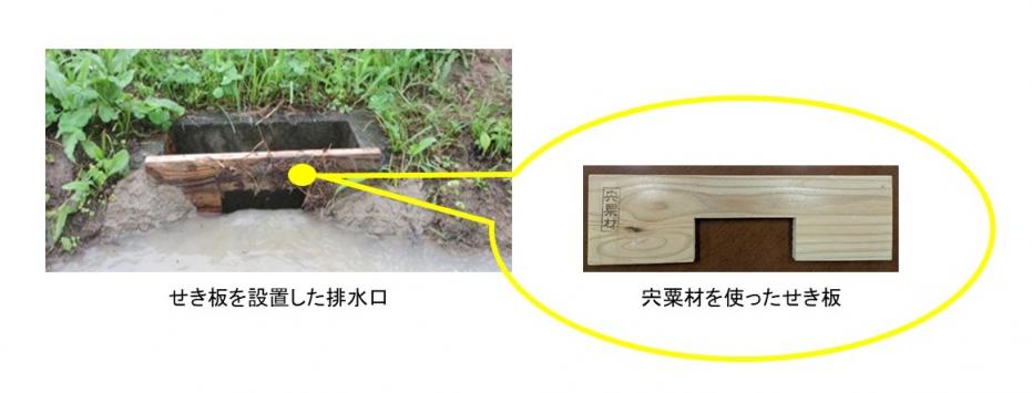 「ためる」対策では、田んぼの排水口に「せき板」を設置することで、雨水を一時的に貯留し、河川への流出を抑制しています。